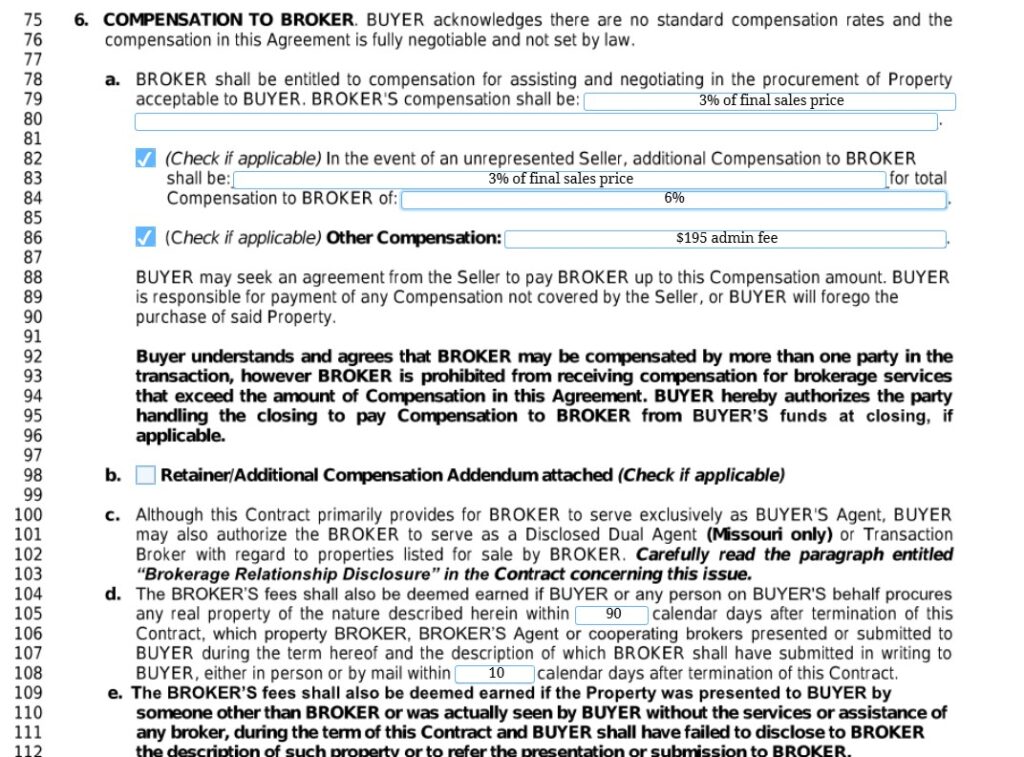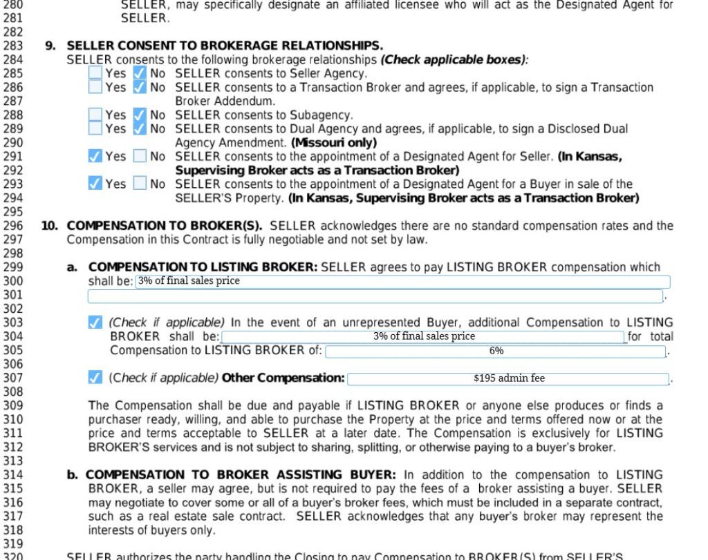 Listing agreement sample – please note that the checkboxes about compensation have been removed entirely. This allows sellers the freedom to negotiate compensation on a case-by-case, offer-by-offer basis! Paragraph 10-b will help you have this conversation!